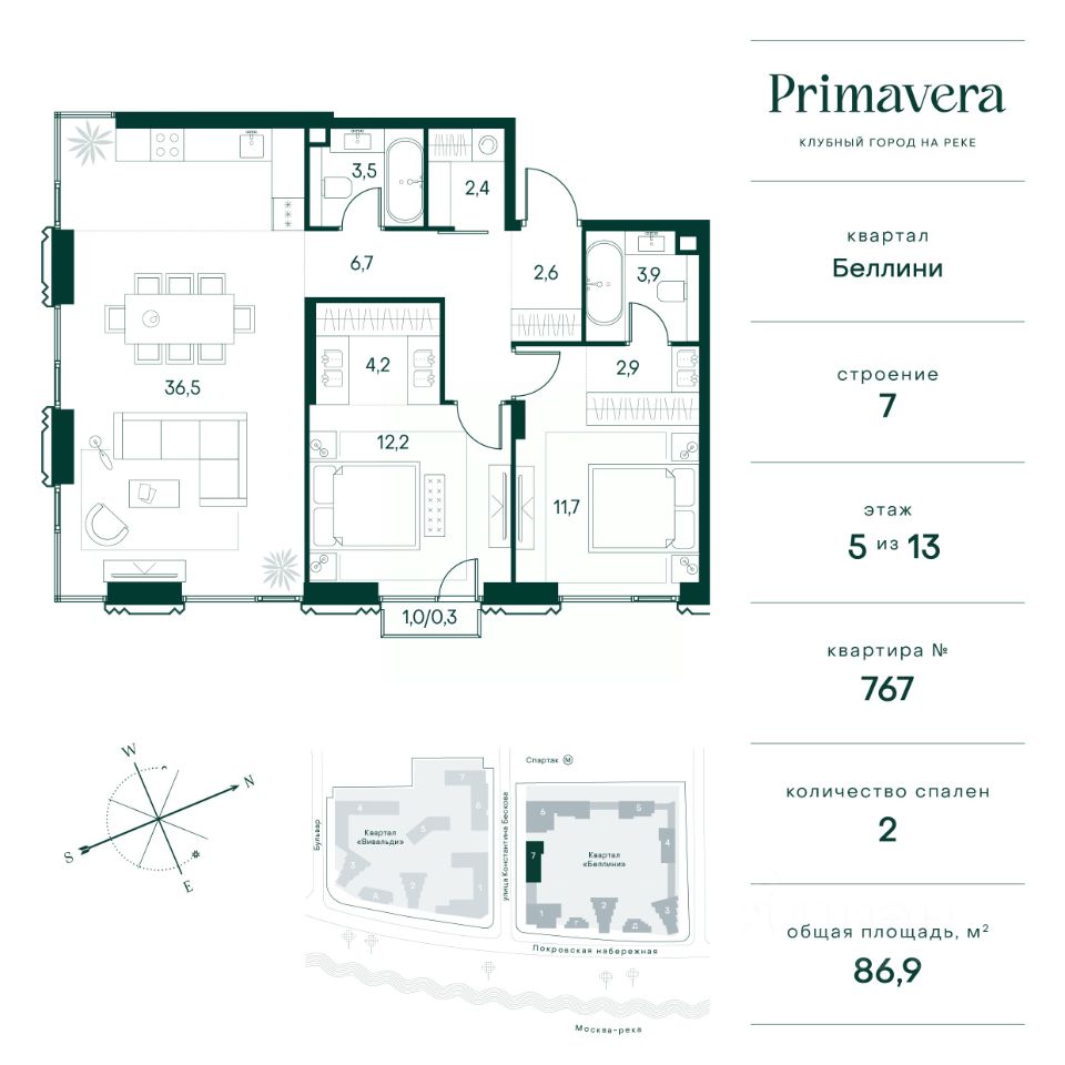 Клубный город на реке Primavera — это респектабельный проект премиум-класса на первой береговой линии Москвы-реки в экологически безупречном районе — Покровское-Стрешнево. Под панорамными окнами квартир расположился собственный экопарк, площадью 12 гектаров с сетью прогулочных дорожек, оборудованный детскими и спортивными площадками, а за ним набережная с собственным пляжем и зонами отдыха. Клубный город на реке Primavera предлагает впечатляющий выбор планировок для любого жизненного сценария: от просторных однокомнатных квартир до пентхаусов и квартир с видовыми террасами или патио. Выбирайте из 120 вариантов эргономичных планировок стандартного и евроформата. В проекте доступны квартиры площадью от 40 до 209 м², в каждой из которых открываются непревзойденные виды на реку, а угол обзора составляет 270 градусов. Из дизайнерских лобби открывается панорамный обзор на зеленый благоустроенный двор. Статусное мебелирование, потолки высотой 6 м и комфортная лаунж-зона отсылают к стилистике высококлассных пятизвездочных отелей. В Primavera есть все, что может предложить мегаполис, здесь все сосредоточено вокруг вас и настроено на ваши желания: - Всестороннее детское развитие в паре шагов от дома: 4 школы, 8 детских садов, развивающие центры с кружками и секциями. - Комфорт мегаполиса на расстоянии приятной прогулки: супермаркеты, кафе, рестораны с верандами на крыше, салоны красоты, аптеки, компании сферы услуг, многофункциональный центр для шоппинга и развлечений. - Умный дом: автоматизированное бесконтактное управление основными системами доступа, инфраструктуры и безопасности через мобильное приложение и специальные метки. Клубный город на реке Primavera выгодно отличается близостью к природе, совмещенной с насыщенной инфраструктурой.