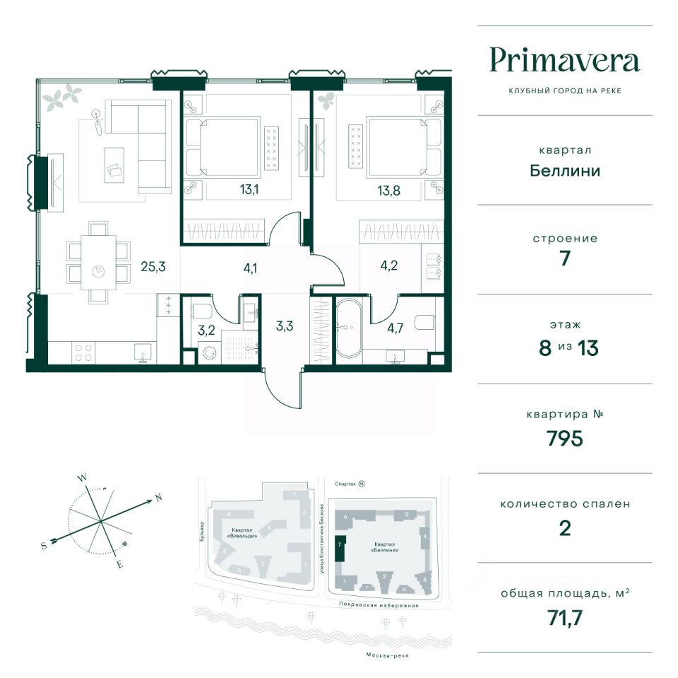 Клубный город на реке Primavera — это респектабельный проект премиум-класса на первой береговой линии Москвы-реки в экологически безупречном районе — Покровское-Стрешнево. Под панорамными окнами квартир расположился собственный экопарк, площадью 12 гектаров с сетью прогулочных дорожек, оборудованный детскими и спортивными площадками, а за ним набережная с собственным пляжем и зонами отдыха. Клубный город на реке Primavera предлагает впечатляющий выбор планировок для любого жизненного сценария: от просторных однокомнатных квартир до пентхаусов и квартир с видовыми террасами или патио. Выбирайте из 120 вариантов эргономичных планировок стандартного и евроформата. В проекте доступны квартиры площадью от 40 до 209 м², в каждой из которых открываются непревзойденные виды на реку, а угол обзора составляет 270 градусов. Из дизайнерских лобби открывается панорамный обзор на зеленый благоустроенный двор. Статусное мебелирование, потолки высотой 6 м и комфортная лаунж-зона отсылают к стилистике высококлассных пятизвездочных отелей. В Primavera есть все, что может предложить мегаполис, здесь все сосредоточено вокруг вас и настроено на ваши желания: - Всестороннее детское развитие в паре шагов от дома: 4 школы, 8 детских садов, развивающие центры с кружками и секциями. - Комфорт мегаполиса на расстоянии приятной прогулки: супермаркеты, кафе, рестораны с верандами на крыше, салоны красоты, аптеки, компании сферы услуг, многофункциональный центр для шоппинга и развлечений. - Умный дом: автоматизированное бесконтактное управление основными системами доступа, инфраструктуры и безопасности через мобильное приложение и специальные метки. Клубный город на реке Primavera выгодно отличается близостью к природе, совмещенной с насыщенной инфраструктурой.