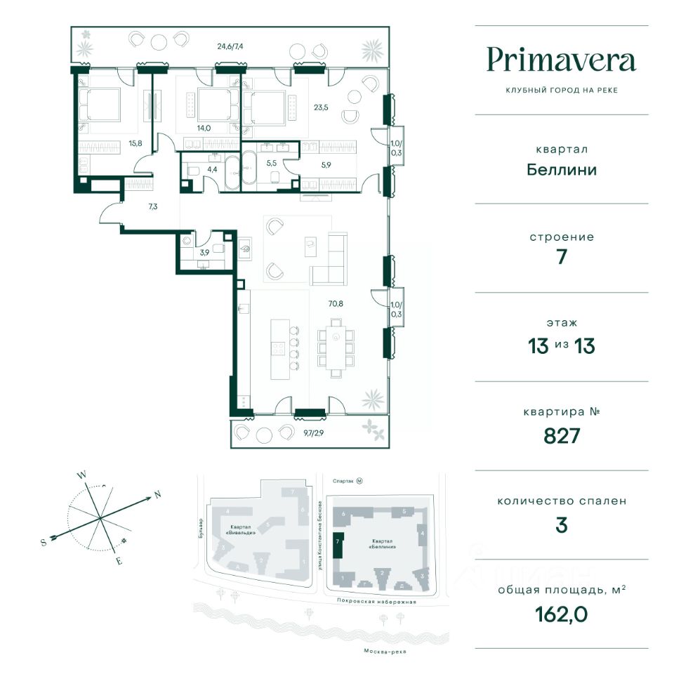 Клубный город на реке Primavera — это респектабельный проект премиум-класса на первой береговой линии Москвы-реки в экологически безупречном районе — Покровское-Стрешнево. Под панорамными окнами квартир расположился собственный экопарк, площадью 12 гектаров с сетью прогулочных дорожек, оборудованный детскими и спортивными площадками, а за ним набережная с собственным пляжем и зонами отдыха. Клубный город на реке Primavera предлагает впечатляющий выбор планировок для любого жизненного сценария: от просторных однокомнатных квартир до пентхаусов и квартир с видовыми террасами или патио. Выбирайте из 120 вариантов эргономичных планировок стандартного и евроформата. В проекте доступны квартиры площадью от 40 до 209 м², в каждой из которых открываются непревзойденные виды на реку, а угол обзора составляет 270 градусов. Из дизайнерских лобби открывается панорамный обзор на зеленый благоустроенный двор. Статусное мебелирование, потолки высотой 6 м и комфортная лаунж-зона отсылают к стилистике высококлассных пятизвездочных отелей. В Primavera есть все, что может предложить мегаполис, здесь все сосредоточено вокруг вас и настроено на ваши желания: - Всестороннее детское развитие в паре шагов от дома: 4 школы, 8 детских садов, развивающие центры с кружками и секциями. - Комфорт мегаполиса на расстоянии приятной прогулки: супермаркеты, кафе, рестораны с верандами на крыше, салоны красоты, аптеки, компании сферы услуг, многофункциональный центр для шоппинга и развлечений. - Умный дом: автоматизированное бесконтактное управление основными системами доступа, инфраструктуры и безопасности через мобильное приложение и специальные метки. Клубный город на реке Primavera выгодно отличается близостью к природе, совмещенной с насыщенной инфраструктурой.