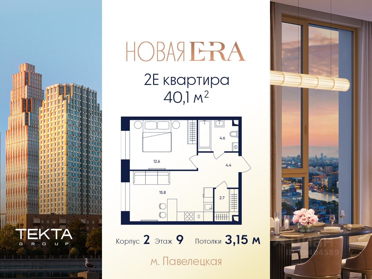 2-комн. квартира в ЖК "Era" на 9 этаже в 33 этажном здании Корпус 2. Общая площадь: 40.1 кв.м., жилая: 22.90 кв.м. Высота потолков 3.15 м.