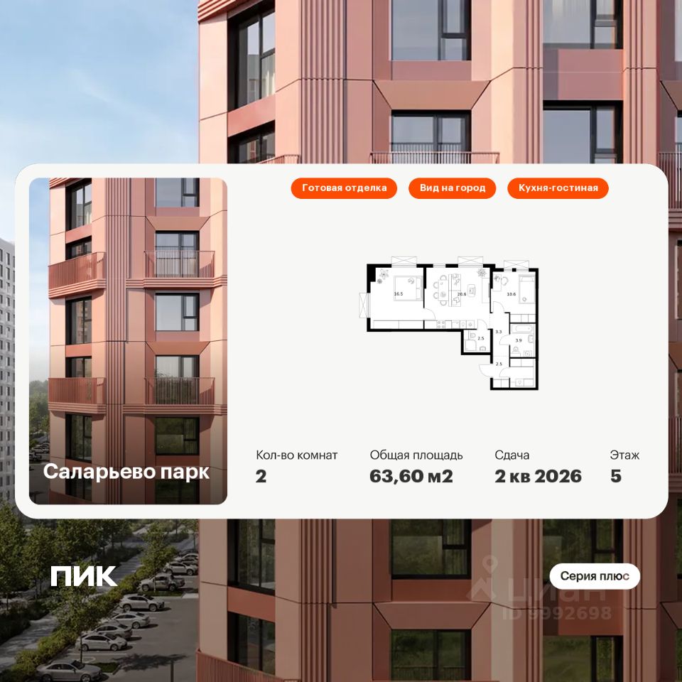 Продаётся 2-комн. квартира площадью 63,6 кв.м на 5 этаже 17 этажного дома (Корпус 20, Секция 1) проекта ПИК Саларьево парк. Светлый просторный подъезд на уровне земли, функциональная планировка, большие окна, c отделкой.