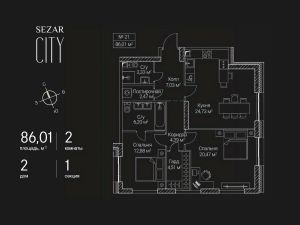 Продается 2-комнатная квартира в ЖК SEZAR CITY на 3 этаже. Общая площадь квартиры составляет 86,01 кв.м. Квартира без отделки. Срок сдачи — 2027 год.