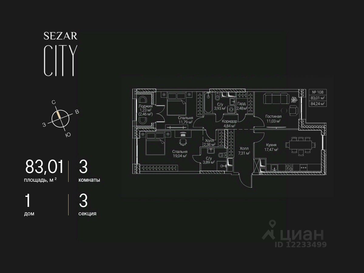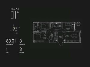 Продается 3-комнатная квартира в ЖК SEZAR CITY на 2 этаже. Общая площадь квартиры составляет 83,01 кв.м. Квартира без отделки. Срок сдачи - 2027 год.