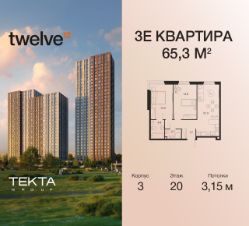 3-комн. квартира в ЖК "Twelve" на 20 этаже в 28 этажном здании Корпус 3. Общая площадь: 65.3 кв.м., жилая: 42.80 кв.м. Высота потолков 3.15 м.