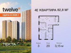 4-комн. квартира в ЖК "Твелв" на 20 этаже в 28 этажном здании Корпус 3. Общая площадь: 82.8 кв.м., жилая: 53.30 кв.м. Высота потолков 3.15 м.