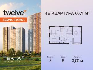 4-комн. квартира в ЖК "Твелв" на 6 этаже в 28 этажном здании Корпус 3. Общая площадь: 83.9 кв.м., жилая: 57.50 кв.м. Высота потолков 3.00 м.