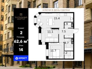Площадь квартиры составляет 62,60 кв.м и находится на 14-ом этаже 24-этажного здания. Концепция комплекса вдохновлена театральной тематикой, предлагая сочетание неоклассической архитектуры с оригинальной отделкой холлов, изысканными фасадами и созданием культурно-просветительского пространства.
