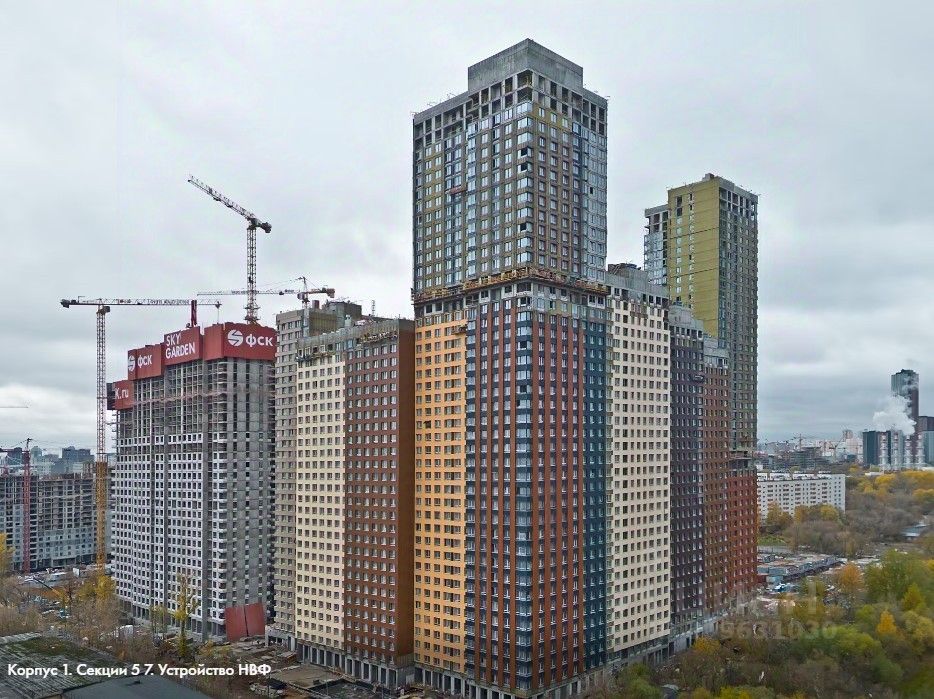 Силуэт жилого комплекса Sky Garden лишен эффекта монолитной стены. ЖК состоит из 4х корпусов, разделенных на секции переменной этажности от 12 до 44 этажей. Создатели Sky Garden спроектировали высотный комплекс, не довлеющий над человеком. Высота секций снижается ближе к пешеходным бульварам.