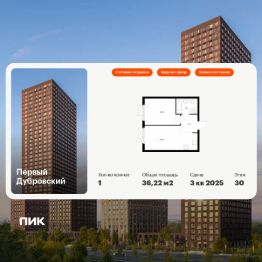 Продаётся 1-комн. квартира площадью 36,22 кв.м на 30 этаже 33 этажного дома (Корпус 1.3, Секция 1) проекта ПИК Первый Дубровский. Светлый просторный подъезд на уровне земли, функциональная планировка, большие окна, c отделкой.