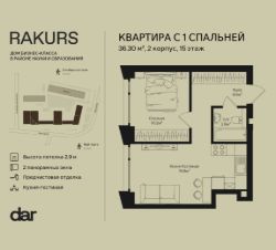 Продаётся 1-комнатная квартира 36.30 м² в жилом комплексе Ракурс. Квартиру отличают панорамное остекление, потолки 2,9 м, улучшенная шумо и воздухоизоляция. Дом сдаётся в 1 квартале 2028 года, продажи проходят через эскроусчета. Подземный паркинг, коворкинг, закрытая благоустроенная территория с фонтаном и артобъектами. Гибкие условия покупки.