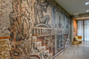 Входные группы облицованы мрамором, натуральным камнем, деревянными и металлическими панелями, декоративной штукатуркой.