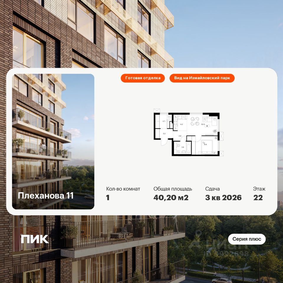 Продаётся 1-комн. квартира площадью 40,2 кв.м на 22 этаже 24 этажного дома (Корпус 1.4, Секция 4) проекта ПИК Плеханова 11. Светлый просторный подъезд на уровне земли, функциональная планировка, большие окна, c отделкой.