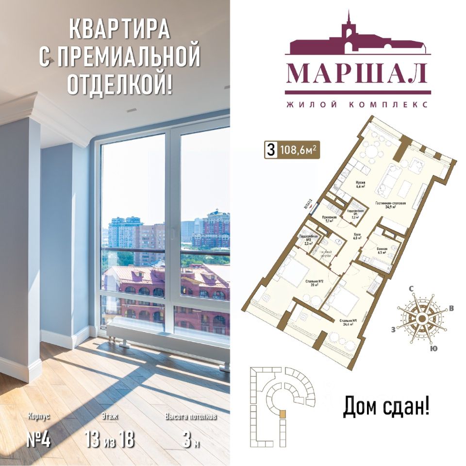 Продаётся 3-комнатная квартира в сданном доме (Маршала Рыбалко, 2К4), срок сдачи: IV-кв. 2011, общей площадью 108.6 кв.м., на 13 этаже. Готовая квартира в элитном МФК "Маршал" с премиальной отделкой "под ключ" (экологичное напольное покрытие - инженерная доска Greenline и керамогранит, высококачественные системы кондиционирования и сантехническое оборудование), выполненной европейскими специалистами по эксклюзивным дизайн-проектам, подчеркнет высокий статус владельца.