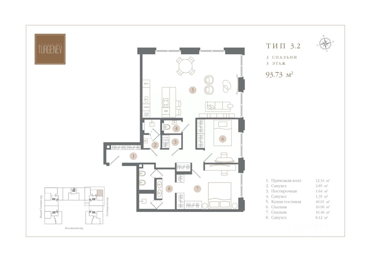 Лот с 2 спальнями с премиальной финишной отделкой находится на 3 этаже Клубного дома TURGENEV. Квартира меблирована дизайнерской мебелью итальянского производителя LEMA, которую может заказать каждый покупатель резиденции в TURGENEV (дополнительная опция). Просторная кухня-столовая-гостиная (40,01 м2) имеет увеличенное количество панорамных окон, благодаря чему возрастает количество естественного света в квартире. Окна кухни-столовой-гостиной выходят на северо-западную сторону на зеленые насаждения и тихий Селиверстов переулок. Панорамные окна мастер-спальни (16,46 м2) и второй спальни (10,96 м2) также выходят на Селиверстов переулок. В каждой спальне и в прихожей-холле (12,34 м2) предусмотрены места для хранения. Помимо просторного санузла с душем и двумя раковинами (8,12 м2) при мастер-спальне, в квартире есть второй санузел с душем, гостевой санузел и постирочная с сушильной и стиральной машинами от немецкого производителя Kuppersbusch в комплекте. Дом сдан.