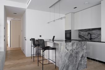 В каждой квартире установлены кухни от итальянского бренда Cesar со встроенной бытовой техникой премиальной линейки Smeg. Кухонный остров, столешница и фартук кухни выполнены из эксклюзивного итальянского мрамора Arabescato Grigio Orobico, одним из лучших видов мрамора на итальянском рынке натуральных отделочных камней.