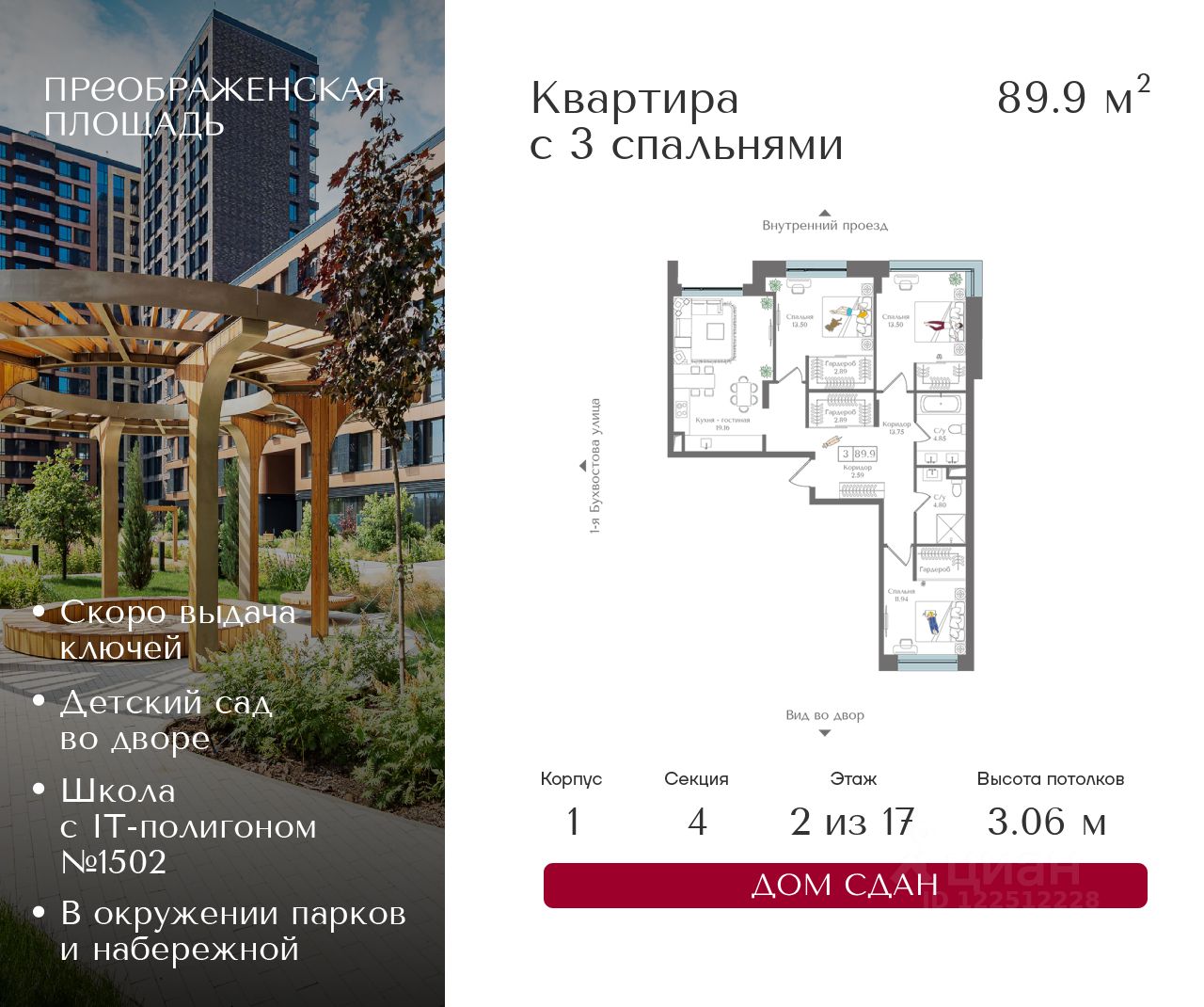 Квартира на 2 этаже в жилом комплексе премиум-класса "Преображенская площадь". Общая площадь: 89.9 кв.м.