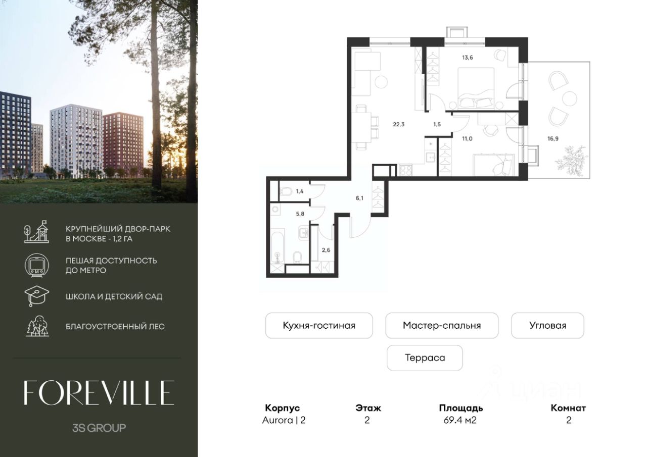 Продается уютная 2-комн. квартира площадью 69,4 кв.м на 2 этаже 17 этажного жилого комплекса бизнес-класса Foreville от 3S Group.