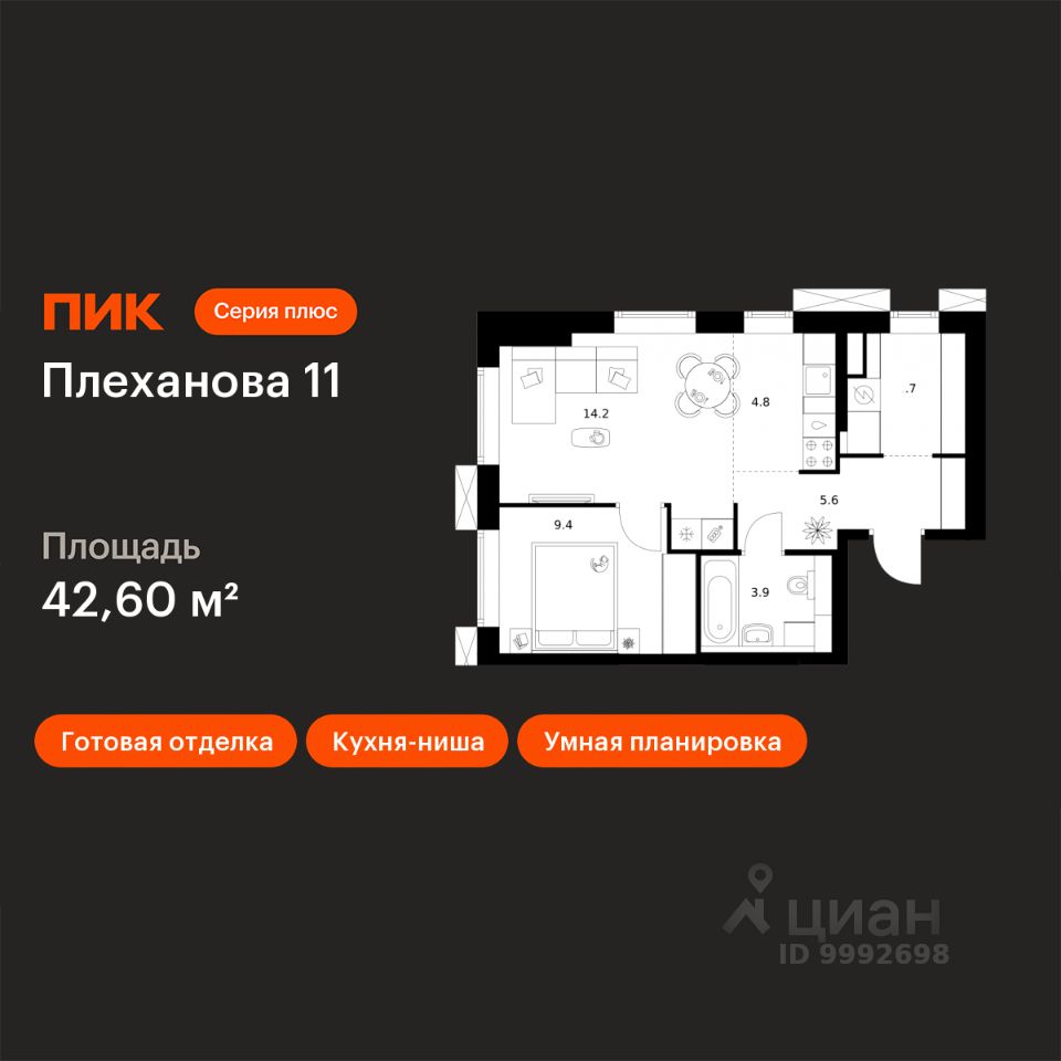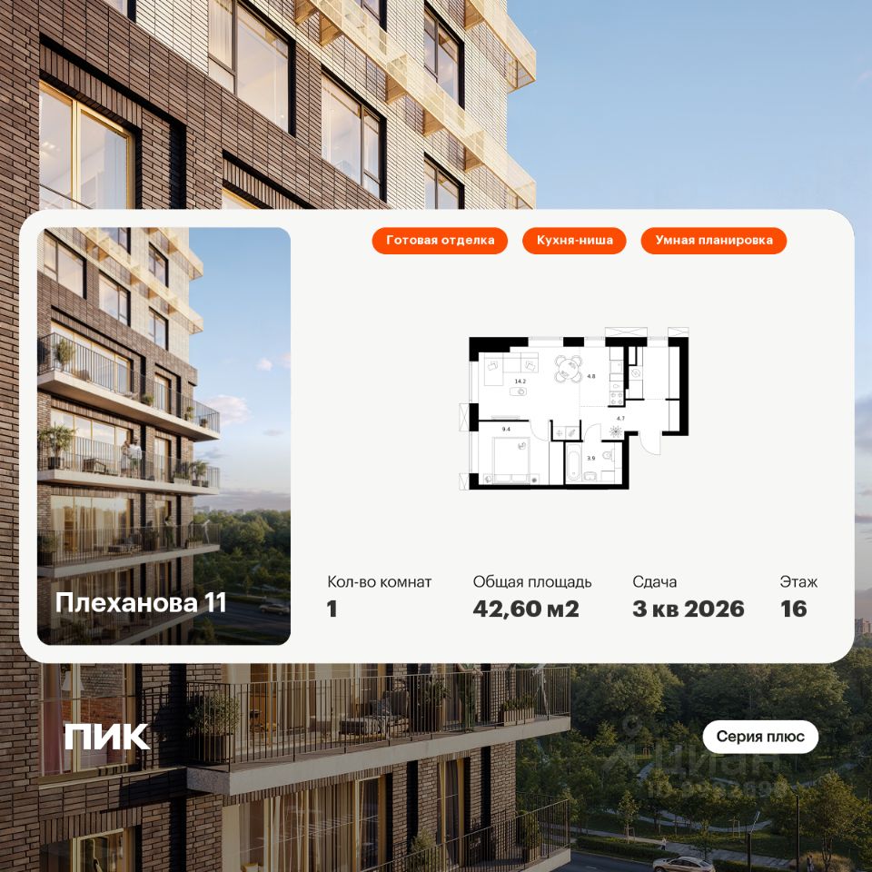 Продаётся 1-комн. квартира площадью 42,6 кв.м на 16 этаже 24 этажного дома (Корпус 1.1, Секция 1) проекта ПИК Плеханова 11. Светлый просторный подъезд на уровне земли, функциональная планировка, большие окна, c отделкой.