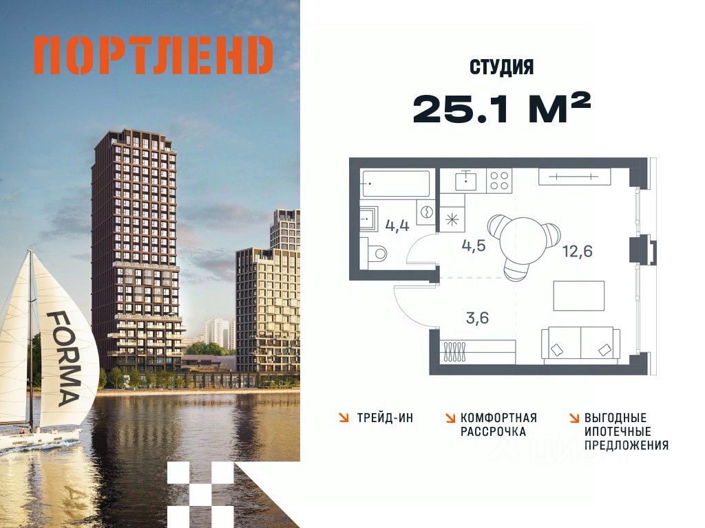 Продаётся студия, 21 этаж в жилом комплексе бизнес-класса ПОРТЛЕНД от девелопера FORMA. ЖК расположен на берегу Москвы-реки в северной части района Печатники в акватории Южного речного порта.