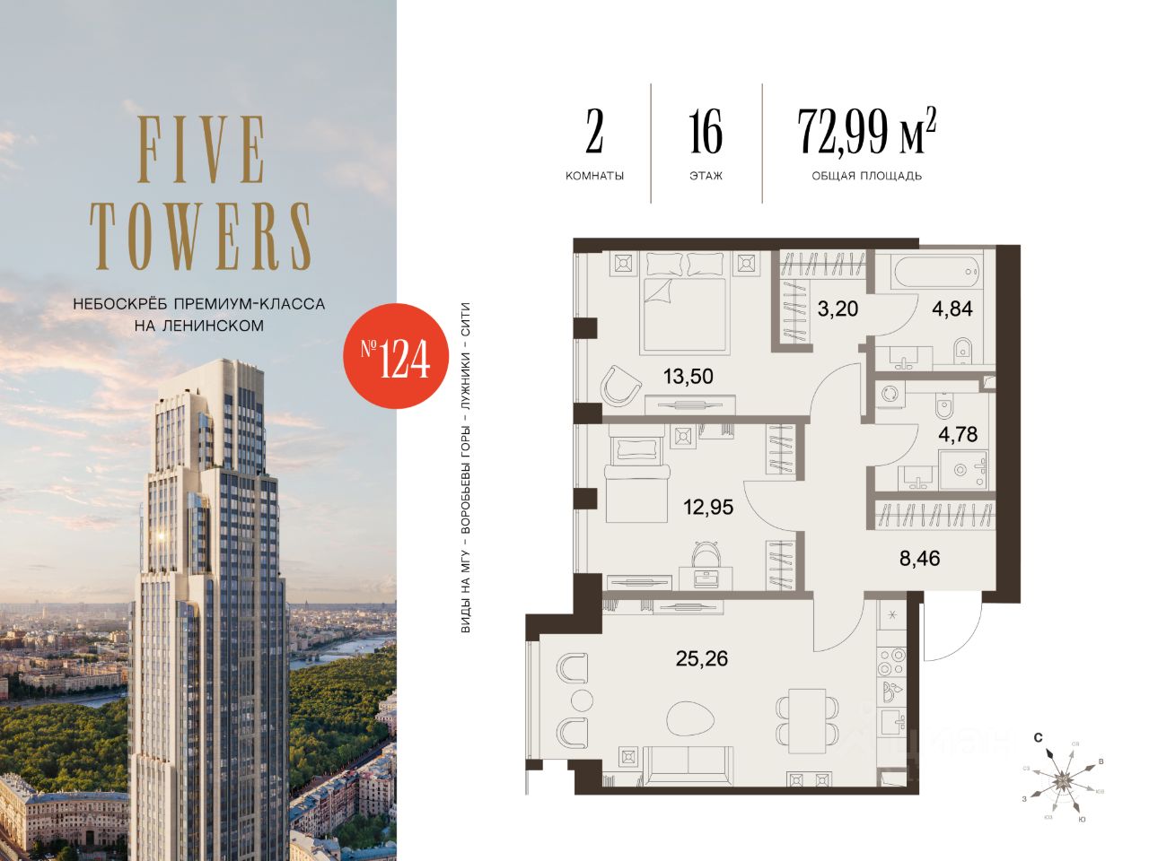Гибкие программы рассрочки: 0% без переплат и удорожания; первый взнос от 10%. • Потрясающие виды на Воробьевы горы, Лужники, главный корпус МГУ и Москву-Сити • Уникальное планировочное решение, позволяющее реализовать различные сценарии жизни • Просторный холл с большой нишей для хранения одежды, обуви и аксессуаров • Наличие гостевого санузла с нишей под стиральную и сушильную машины • Все комнаты, включая кухню-гостиную, изолированы друг от друга • Малая спальня с двумя панорамными окнами • Большая кухня-гостиная с панорамным остеклением (почти 25 кв. м) • Приватный мастер-блок площадью 21,5 кв. м с двумя панорамными окнами в спальне, личным санузлом и вместительной гардеробной комнатой О проекте FIVE TOWERS — первый жилой небоскрёб на Ленинском проспекте и самый высокий дом столицы за пределами делового кластера "Москва-Сити". Премиальный небоскрёб представляет собой ультрасовременное, высокотехнологичное здание, идеальный синтез стилей культовых высоток Москвы и небоскребов Нью-Йорка и поражает воображение уникальными видами, монументальной роскошью и совершенством форм. Величественная панорама, открывающаяся из окон вашей квартиры, завораживает: легендарные сталинские высотки, шпиль главного корпуса МГУ, "Москва-Сити", спорткомплекс "Лужники". Окружение 75-этажный жилой комплекс премиум-класса расположен в историческом Донском районе. Транспортная инфраструктура проекта сделает жизнь резидентов FIVE TOWERS комфортной и продуманной: удобные выезды на ТТК и Садовое кольцо, 10 минут до метро "Ленинский проспект", 11 минут на МЦК до Москва-Сити. Рядом расположены крупные деловые и бизнес-центры, а в шаговой доступности — 500 га парков, образуемых Музеоном, Парком Горького и парком "Воробьевы горы". Инфраструктура Архитектурное бюро Олега Клодта разработало дизайн общественных пространств FIVE TOWERS: гранд-лобби, камерную библиотеку c камином и лифтовую зону. Все необходимые сервисы сосредоточены на первых этажах небоскрёба: кафе, винотека, салон красоты, фитнес и детский клуб. Приватный Sky Club 49 — респектабельный лаундж с открытой террасой и ограниченным доступом на 49 этаже — только для резидентов. Квартиры в FIVE TOWERS Все квартиры в FIVE TOWERS будут сданы с предчистовой отделкой (white box). Это позволит будущим резидентам комплекса сосредоточиться на творческой части ремонта, не связанной с организацией черновых работ. В жилом небоскребе FIVE TOWERS запланировано 596 премиальных квартир и 87 типов планировочных решений, которые можно адаптировать под личные запросы и сценарии проживания. В комплексе премиум-класса представлены не только двух- и трехкомнатные квартиры с угловым остеклением, но и однокомнатные с видом на две стороны и трехкомнатные квартиры с видами на три стороны, что является редким предложением на рынке недвижимости.