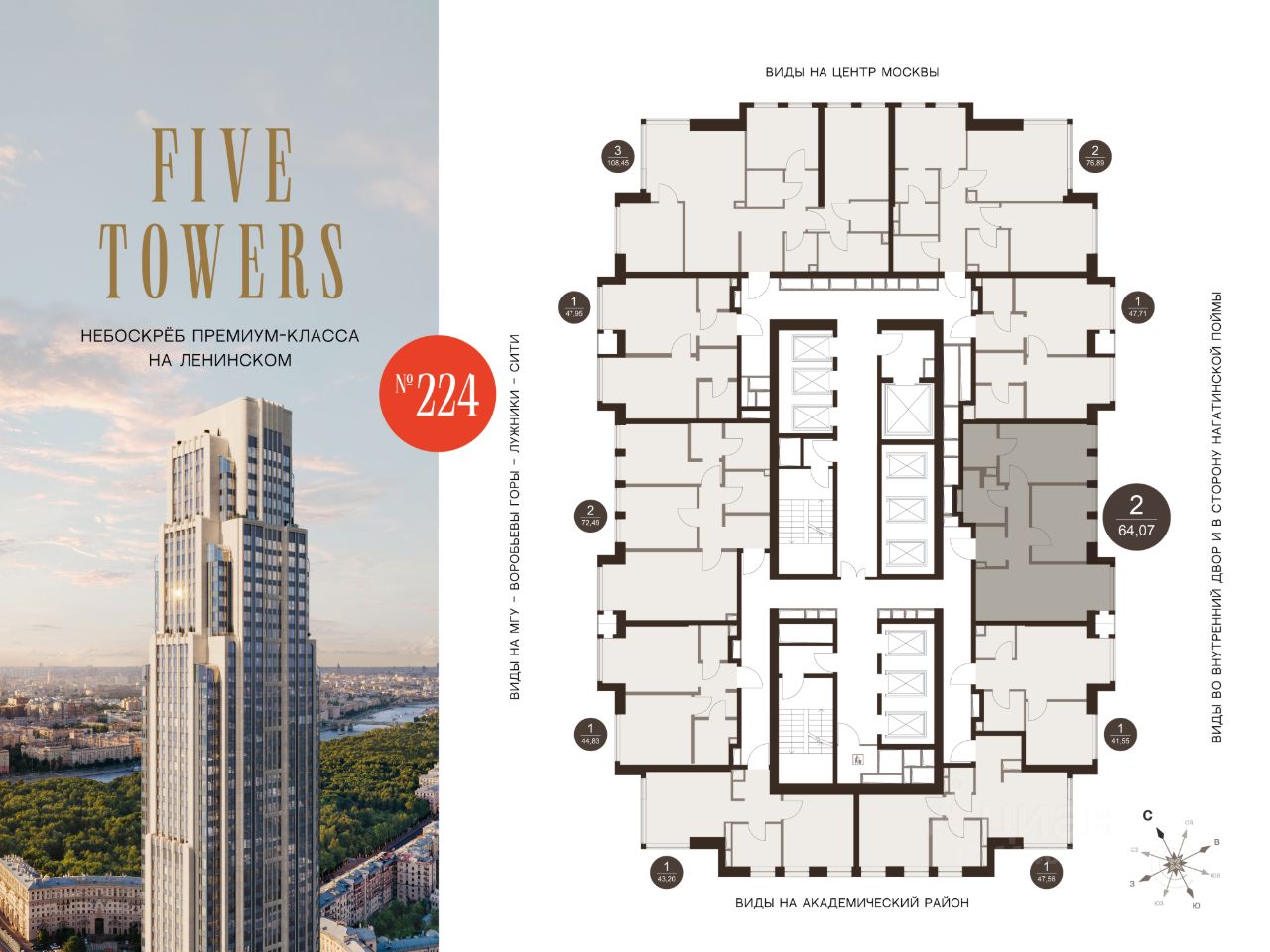 Гибкие программы рассрочки: 0% без переплат и удорожания; первый взнос от 10%. • Продуманное планировочное решение с удобным функциональным зонированием • Просторный холл с большой нишей для хранения вещей • Наличие гостевого санузла с нишей под стиральную и сушильную машины • Все комнаты, включая кухню-гостиную, изолированы друг от друга • Малая спальня с двумя панорамными окнами • Большая кухня-гостиная (более 21 кв. м) с панорамным окном • Мастер-спальня с двумя панорамными окнами и приватным санузлом О проекте FIVE TOWERS — первый жилой небоскрёб на Ленинском проспекте и самый высокий дом столицы за пределами делового кластера "Москва-Сити". Премиальный небоскрёб представляет собой ультрасовременное, высокотехнологичное здание, идеальный синтез стилей культовых высоток Москвы и небоскребов Нью-Йорка и поражает воображение уникальными видами, монументальной роскошью и совершенством форм. Величественная панорама, открывающаяся из окон вашей квартиры, завораживает: легендарные сталинские высотки, шпиль главного корпуса МГУ, "Москва-Сити", спорткомплекс "Лужники". Окружение 75-этажный жилой комплекс премиум-класса расположен в историческом Донском районе. Транспортная инфраструктура проекта сделает жизнь резидентов FIVE TOWERS комфортной и продуманной: удобные выезды на ТТК и Садовое кольцо, 10 минут до метро "Ленинский проспект", 11 минут на МЦК до Москва-Сити. Рядом расположены крупные деловые и бизнес-центры, а в шаговой доступности — 500 га парков, образуемых Музеоном, Парком Горького и парком "Воробьевы горы". Инфраструктура Архитектурное бюро Олега Клодта разработало дизайн общественных пространств FIVE TOWERS: гранд-лобби, камерную библиотеку c камином и лифтовую зону. Все необходимые сервисы сосредоточены на первых этажах небоскрёба: кафе, винотека, салон красоты, фитнес и детский клуб. Приватный Sky Club 49 — респектабельный лаундж с открытой террасой и ограниченным доступом на 49 этаже — только для резидентов. Квартиры в FIVE TOWERS Все квартиры в FIVE TOWERS будут сданы с предчистовой отделкой (white box). Это позволит будущим резидентам комплекса сосредоточиться на творческой части ремонта, не связанной с организацией черновых работ. В жилом небоскребе FIVE TOWERS запланировано 596 премиальных квартир и 87 типов планировочных решений, которые можно адаптировать под личные запросы и сценарии проживания. В комплексе премиум-класса представлены не только двух- и трехкомнатные квартиры с угловым остеклением, но и однокомнатные с видом на две стороны и трехкомнатные квартиры с видами на три стороны, что является редким предложением на рынке недвижимости.
