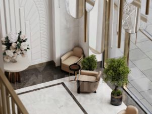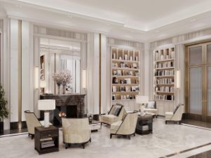 Архитектурное бюро Олега Клодта разработало дизайн общественных пространств ФАЙВ ТАУЭРС: гранд-лобби, камерную библиотеку c камином и лифтовую зону. Все необходимые сервисы сосредоточены на первых этажах небоскрёба: кафе, винотека, салон красоты, фитнес и детский клуб. Приватный Sky Club 49 — респектабельный лаундж с открытой террасой и ограниченным доступом на 49 этаже — только для резидентов.