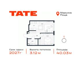 Продается 1-комнатная квартира от застройщика в ЖК премиум-класса TATE на 22 этаже. Общая площадь 40,03 м². Отделка предчистовая (white box). 1 санузел. Вид из окна на Парк Сокольники. Башня A.