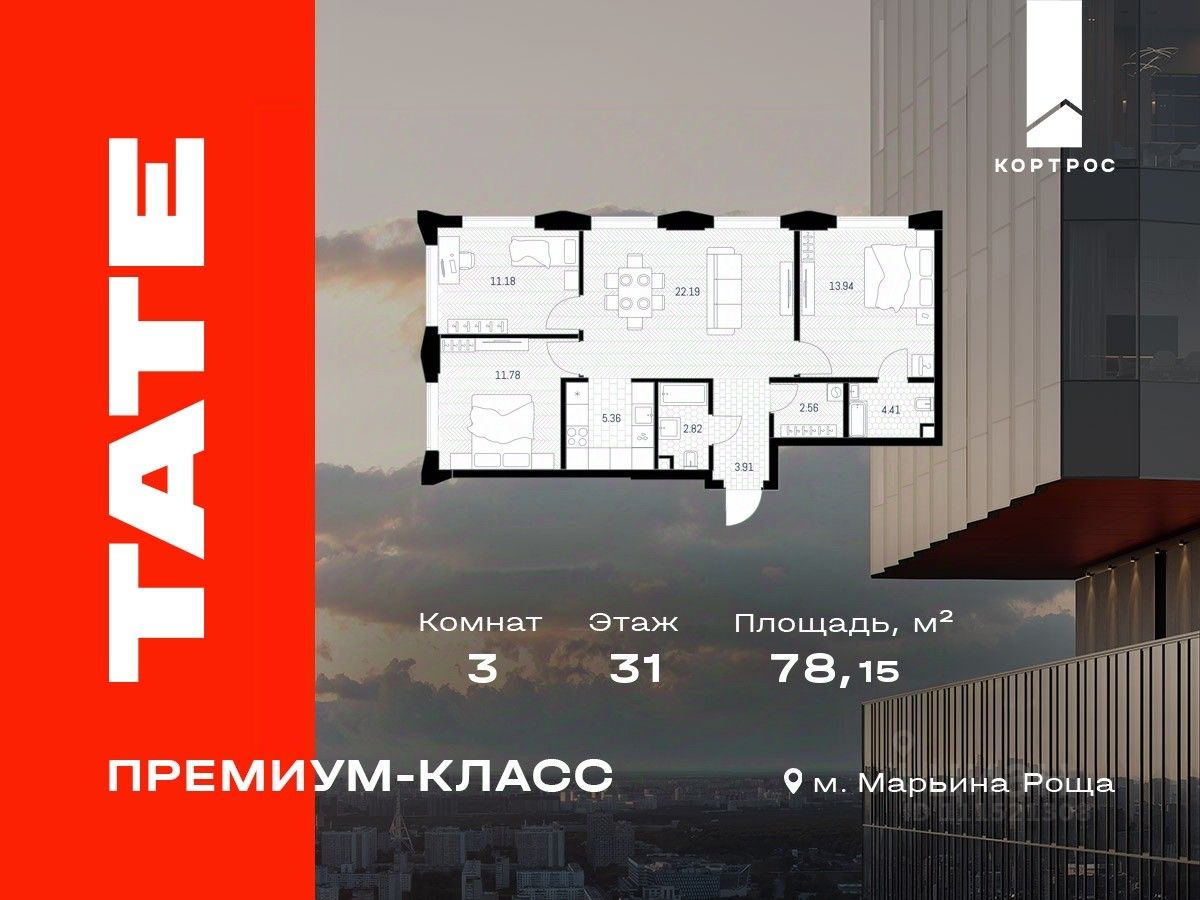 Продается 3-комнатная квартира от застройщика в ЖК премиум-класса TATE на 31 этаже. Общая площадь 78,15 м². Отделка предчистовая (white box). 2 санузла. Вид из окна на Тимирязевский парк, Парк Останкино/ВДНХ. Угловое остекление. Мастер-спальня. Гардеробная. Башня A.