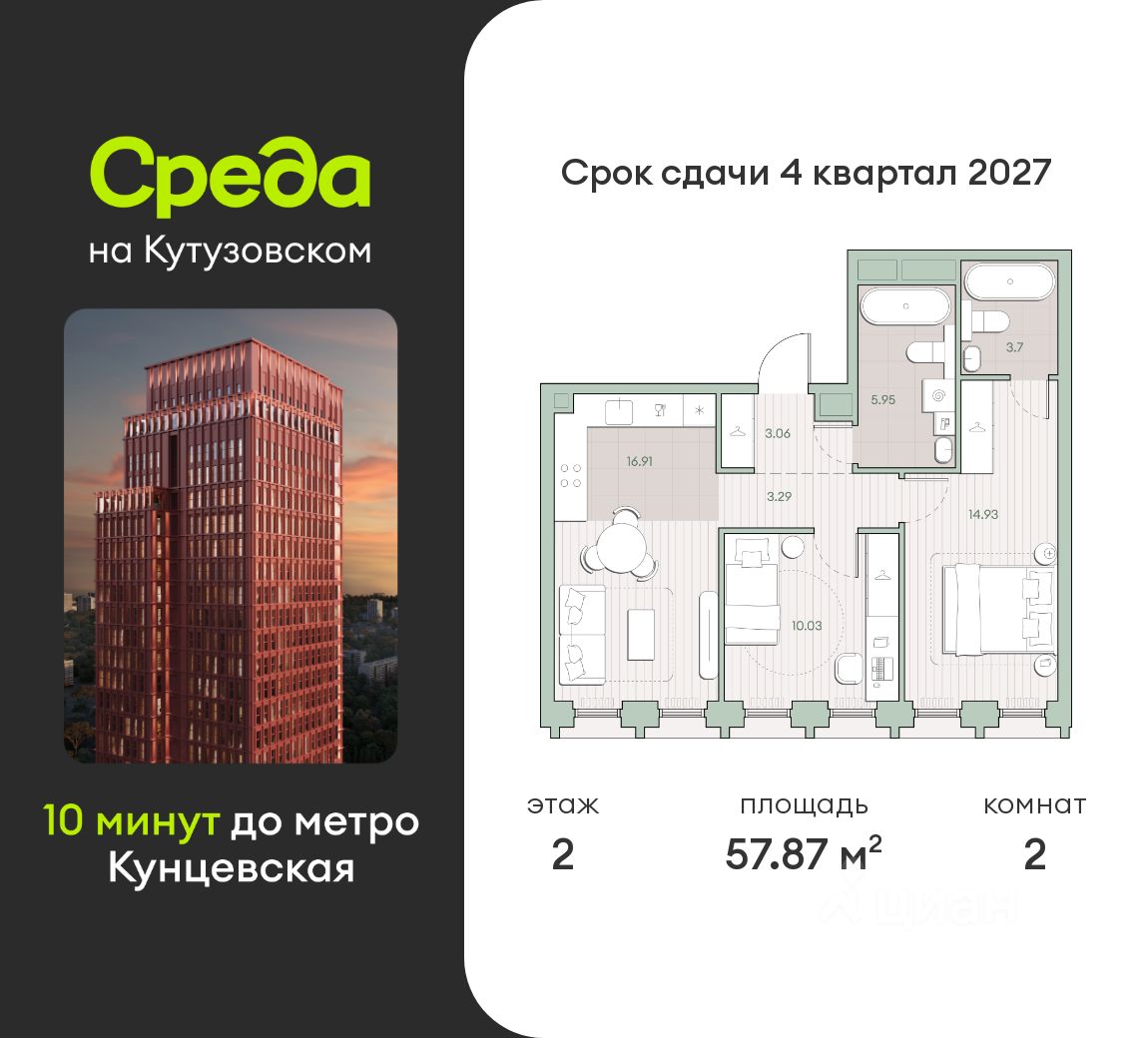 Продаётся 2-комнатная квартира общей площадью 57.87 кв.м. с отделкой white box. Квартира расположена на 2 этаже корпуса 4.1 в жилом комплексе бизнес-класса "Среда на Кутузовском" в пешей доступности от метро "Кунцевская".