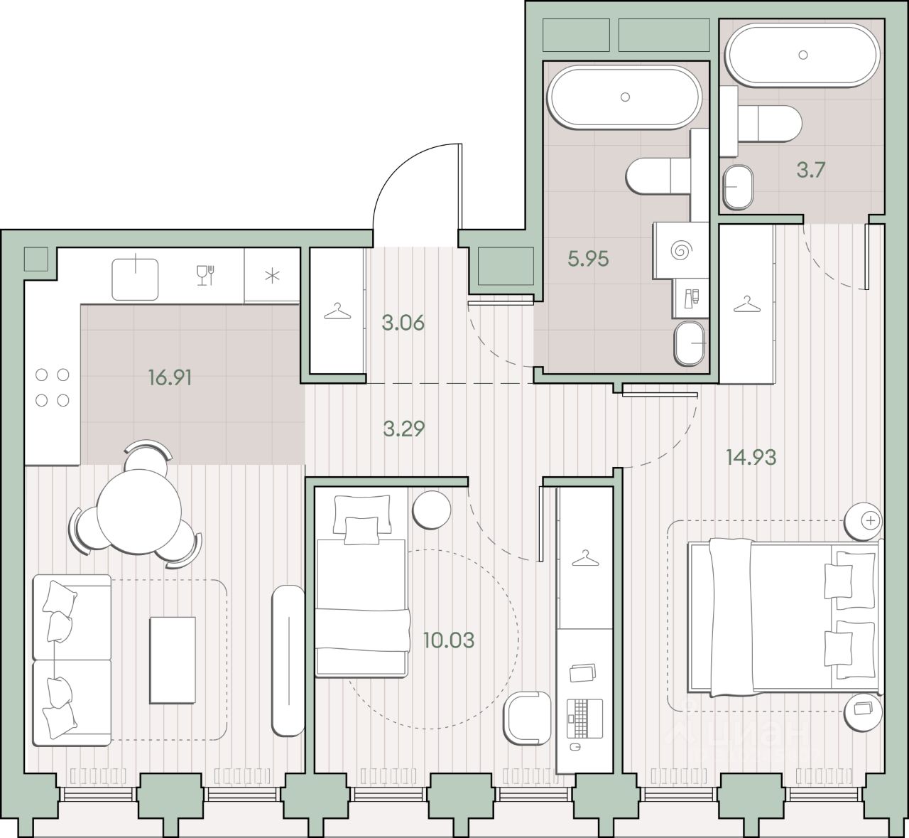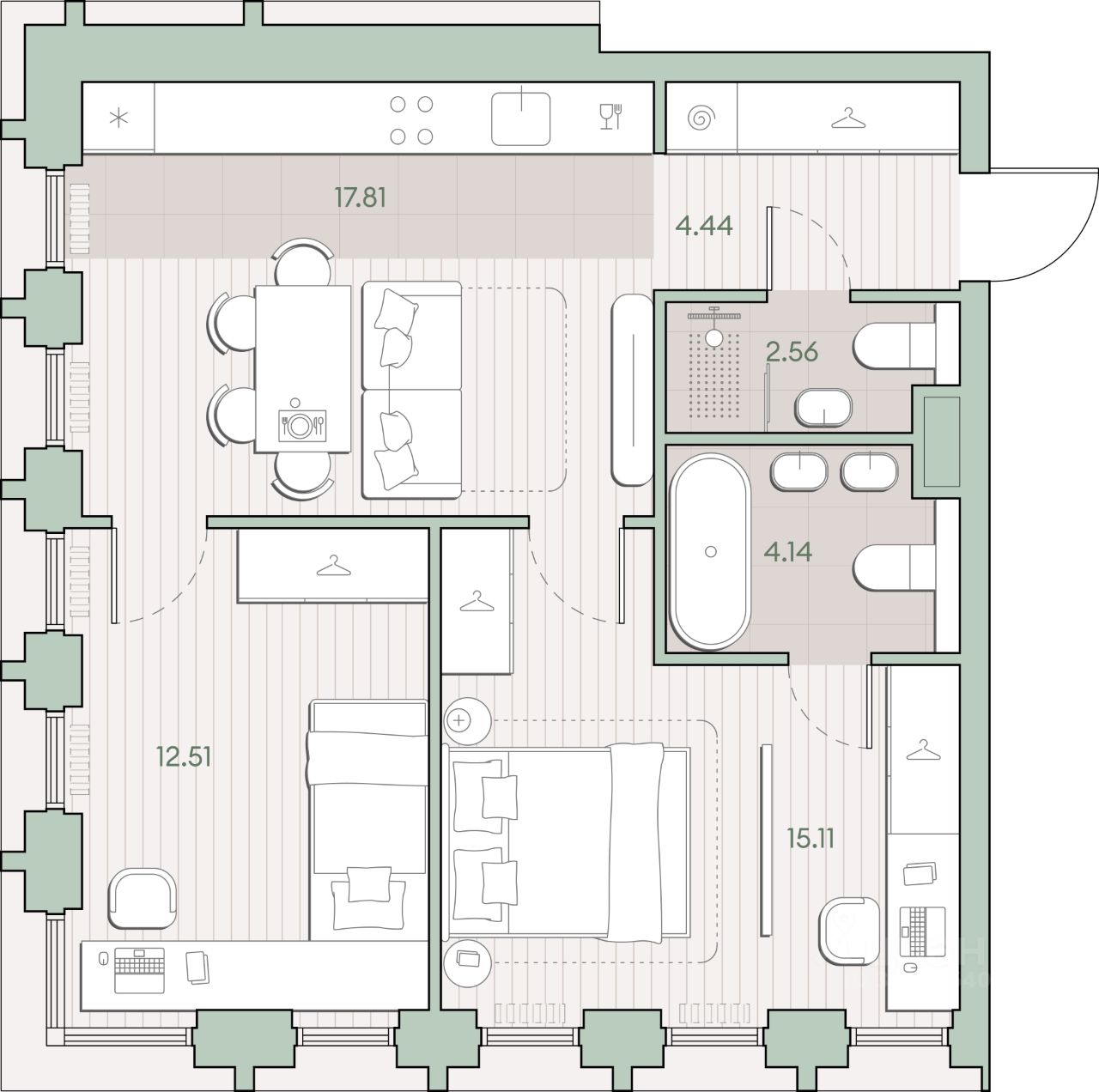 Продаётся 2-комнатная квартира общей площадью 56.57 кв.м. с отделкой white box. Квартира расположена на 2 этаже корпуса 4.1 в жилом комплексе бизнес-класса "Среда на Кутузовском" в пешей доступности от метро "Кунцевская".