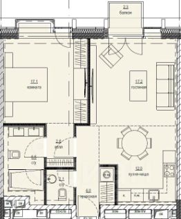 Удобная планировка квартиры 64,75м2, в которой предусмотрено: кухня-гостиная 29,3м2, спальня 17,2м2, холл 8,6м2, гостевой санузл 2,1м2 и санузел мастер-спальни 6,6м2 с полным оснащением, БАЛКОН 2,3м2. Центральная система кондиционирования, окна открываются.