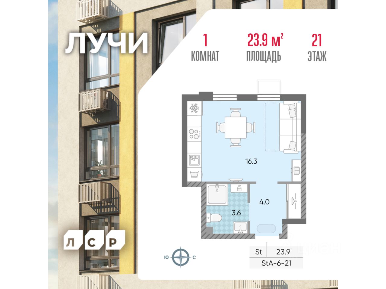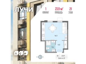 Продается квартира-студия общей площадью 23.9 кв. метров на 21 этаже жилого комплекса Лучи.