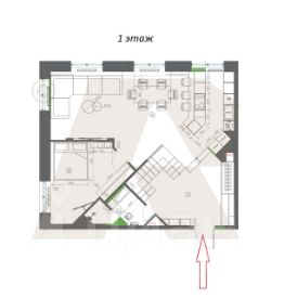 Первый уровень: зона холла со шкафами для хранения вещей. Гостевой санузел, Кухня (там же выход на террасу) совмещенная с гостиной, изолированная спальня. Лестница на второй этаж.