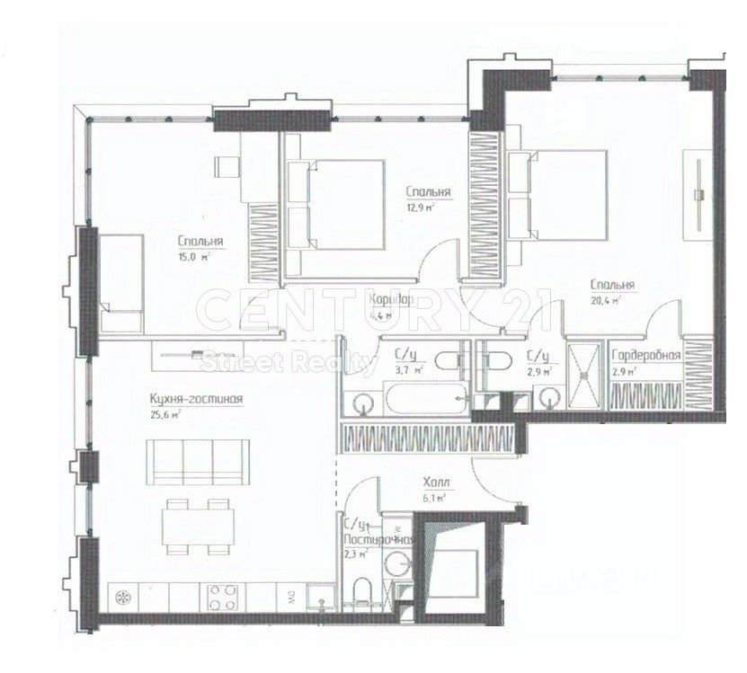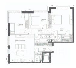 Планировкой квартиры предусмотрены: просторная кухня-гостиная, три изолированные спальные комнаты, два санузла, постирочная и гардеробная комнаты.