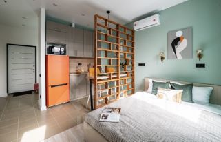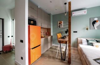Пространство студии грамотно и функционально зонировано для комфортной жизни - выделены зона кухни с барной стойкой, зоны отдыха и работы, зона спальни, совмещённый санузел.