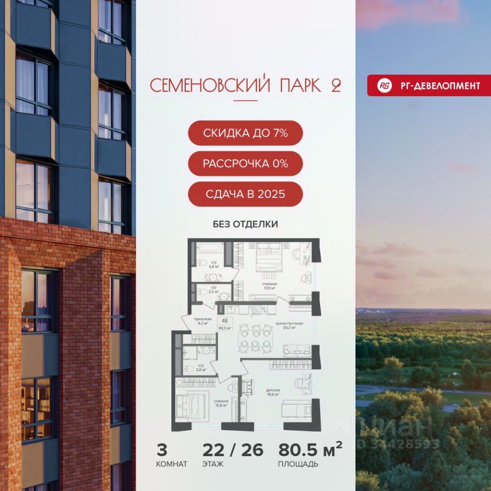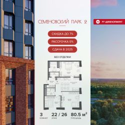 Продается 3-к квартира 80,5 кв.м. в ЖК "Семеновский парк 2" на 22-м этаже 26 этажного дома.
