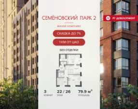 Продается 3-к квартира 79,9 кв.м. в ЖК "Семеновский парк 2" на 22-м этаже 26 этажного дома.