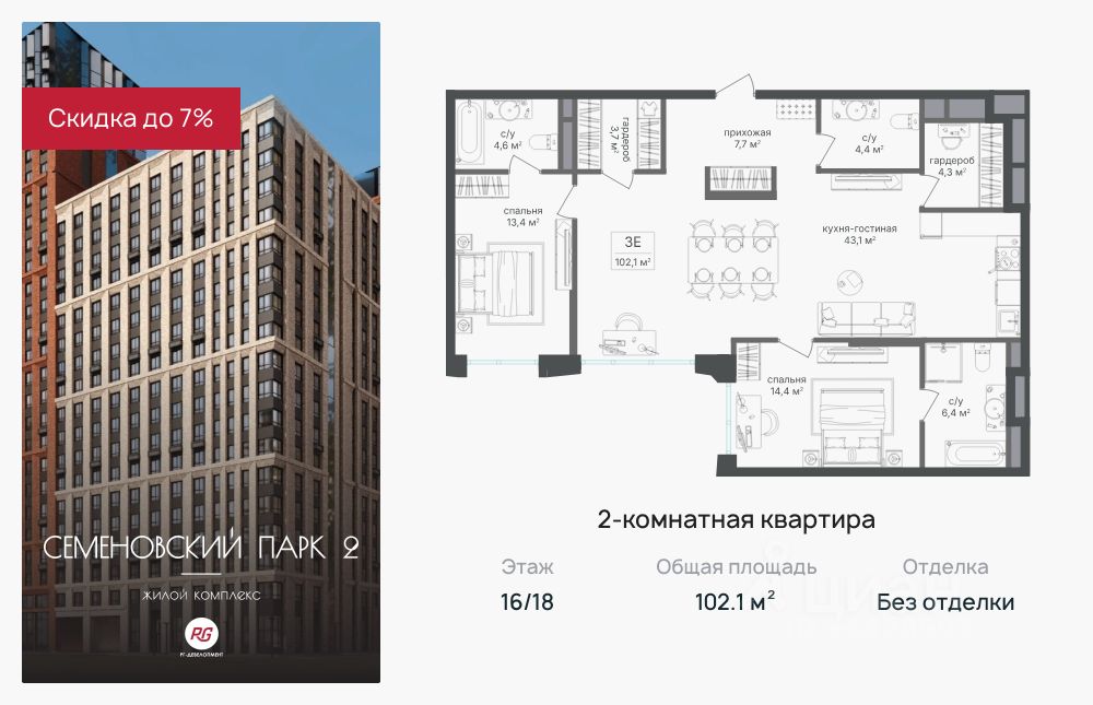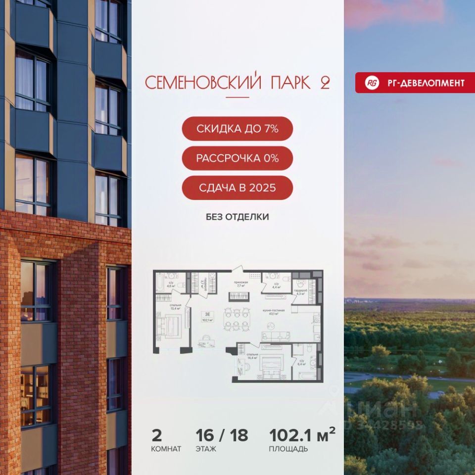 Продается 2-к квартира 102,1 кв.м. в ЖК "Семеновский парк 2" на 16-м этаже 18 этажного дома.