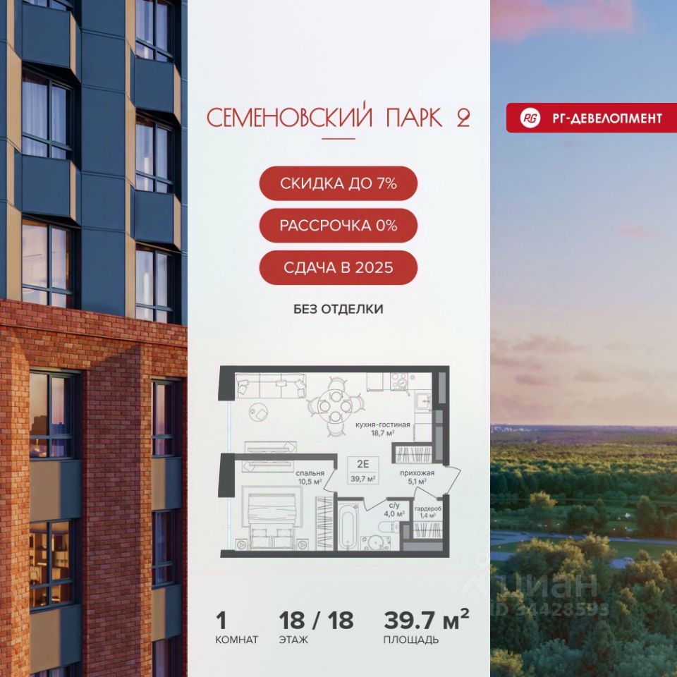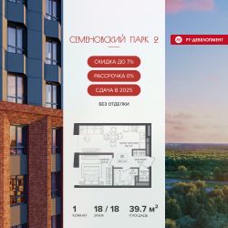 Продается 1-к квартира 39,7 кв.м. в ЖК "Семеновский парк 2" на 18-м этаже 18 этажного дома.