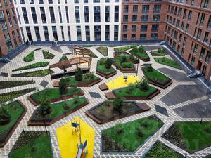 На территории прогулочная зона с фонтаном, зимой в каждом дворе заливают каток.