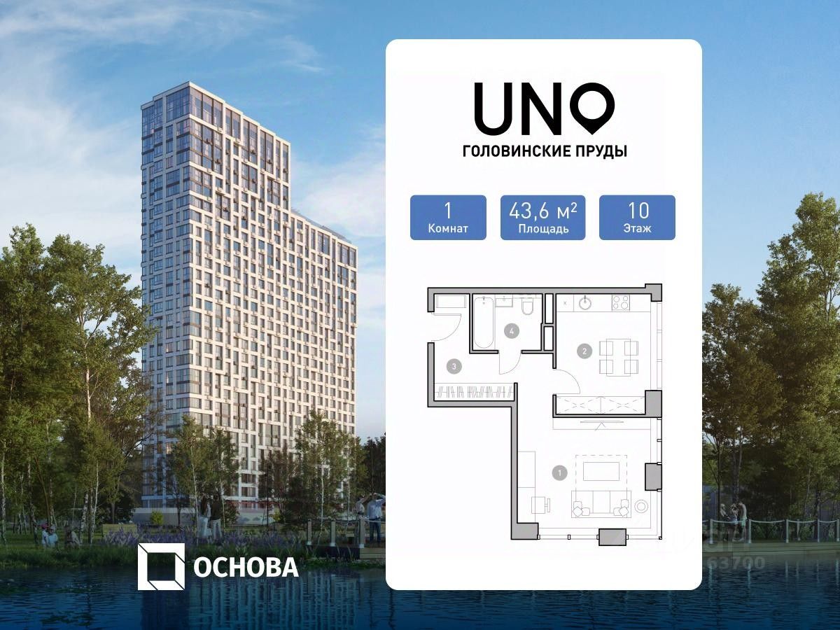 Продается 1-комн. квартира площадью 43,6 кв.м. на 10-м этаже 28 этажного дома в ЖК "UNO Головинские пруды" от ГК ОСНОВА.