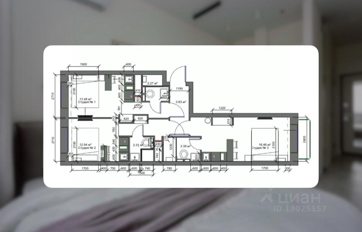 Апартаменты с современным ремонтом площадью 55 кв м разделены на три изолированные студии ~ по 18,3 кв.м. с видом на ВДНХ. Каждая студия полностью укомплектована мебелью, техникой, всем необходимым для сдачи жилья.