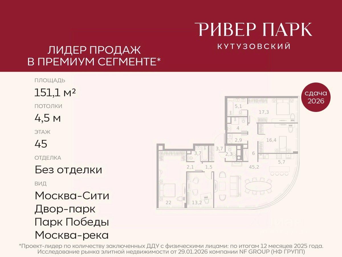 Продается 4-к квартира площадью 151.1 кв.м. на 45-м этаже в жилом комплексе премиум-класса Ривер Парк Кутузовский в Башне Топаз