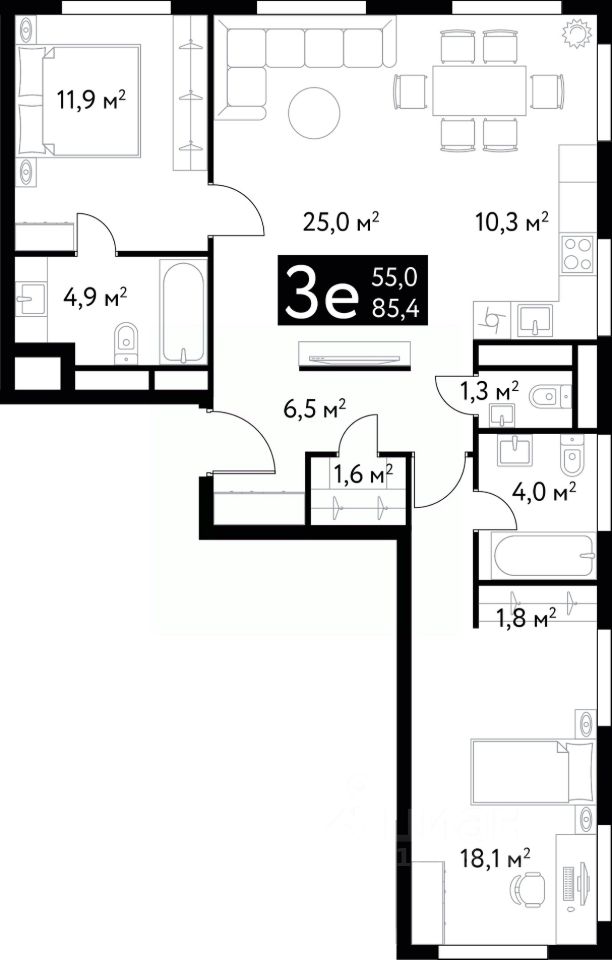 Трехкомнатная квартира на 10 этаже корпуса 2 премиального жилого комплекса DIALOG. Окна квартиры выходят на три стороны света.