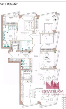 Планировочное решение ДЛЯ БОЛЬШОЙ СЕМЬИ: кухня-гостиная-столовая, мастер-спальня с ванной и гардеробной, 2 детские спальни с ванной комнатой, кабинет/четвертая спальня, гостевой с/у, постирочная, гардеробная.