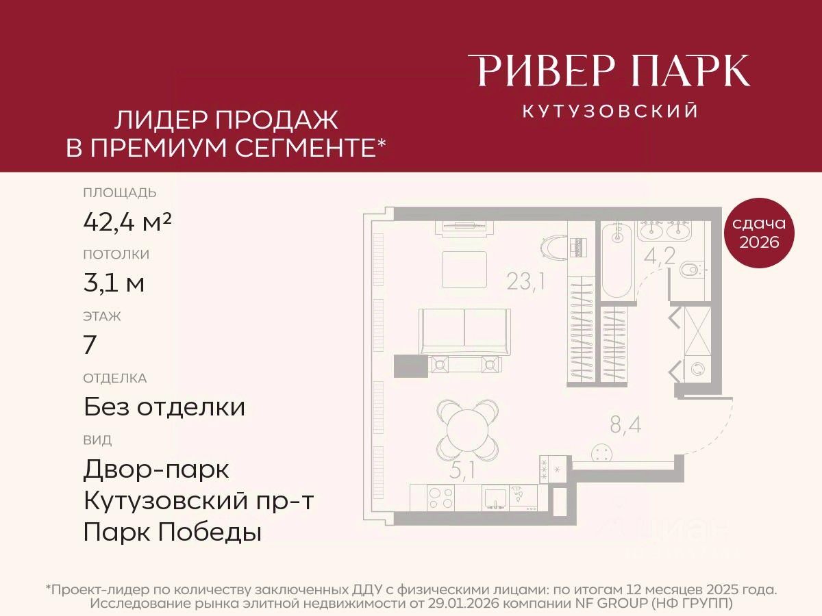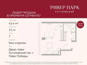 Продается студия площадью 42.4 кв.м. на 7-м этаже в жилом комплексе премиум-класса Ривер Парк Кутузовский в Башне Янтарь