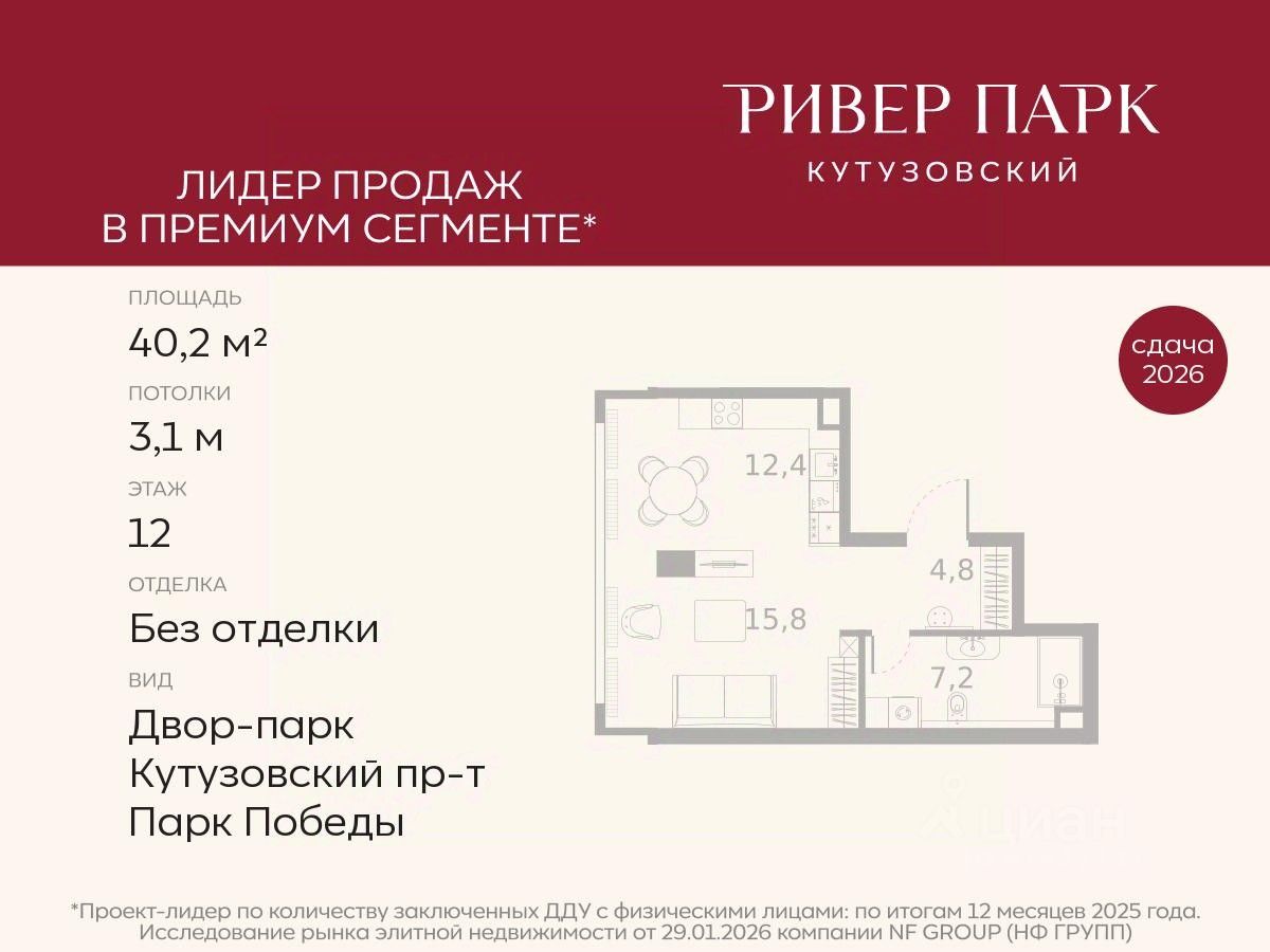 Продается студия площадью 40.2 кв.м. на 12-м этаже в жилом комплексе премиум-класса Ривер Парк Кутузовский в Башне Янтарь
