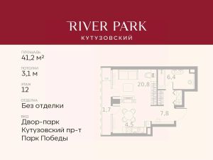 Продается студия площадью 41.2 кв.м. на 12-м этаже в жилом комплексе премиум-класса River Park Кутузовский в Башне Amber Tower
