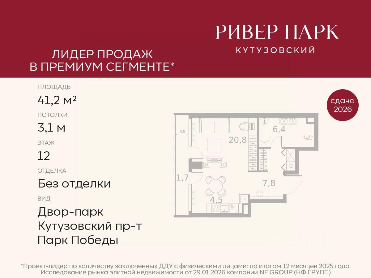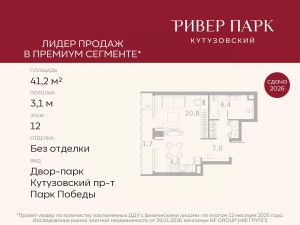 Продается студия площадью 41.2 кв.м. на 12-м этаже в жилом комплексе премиум-класса Ривер Парк Кутузовский в Башне Янтарь