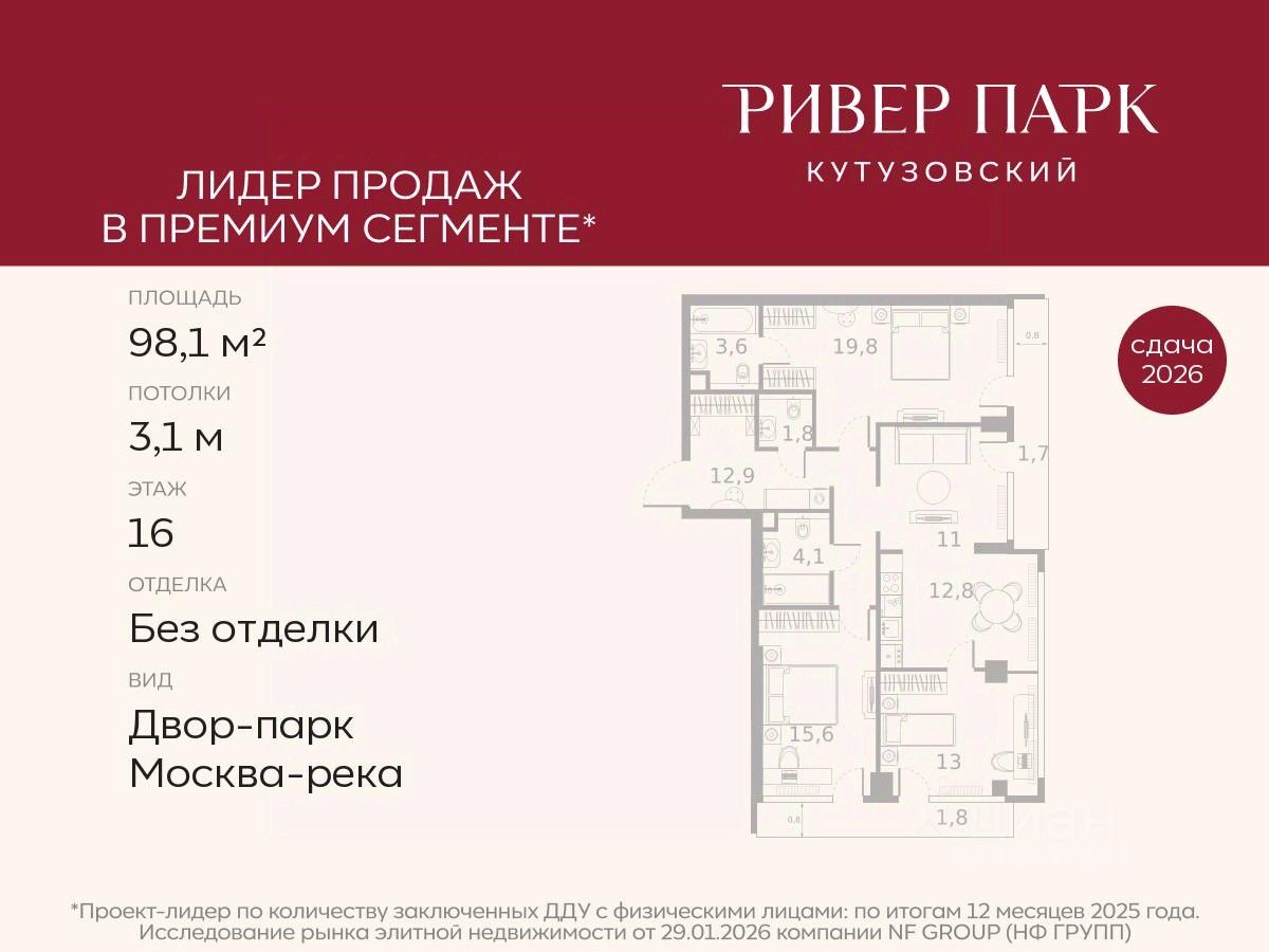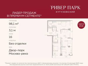 Продается 3-к квартира площадью 98.1 кв.м. на 16-м этаже в жилом комплексе премиум-класса Ривер Парк Кутузовский в Башне Янтарь